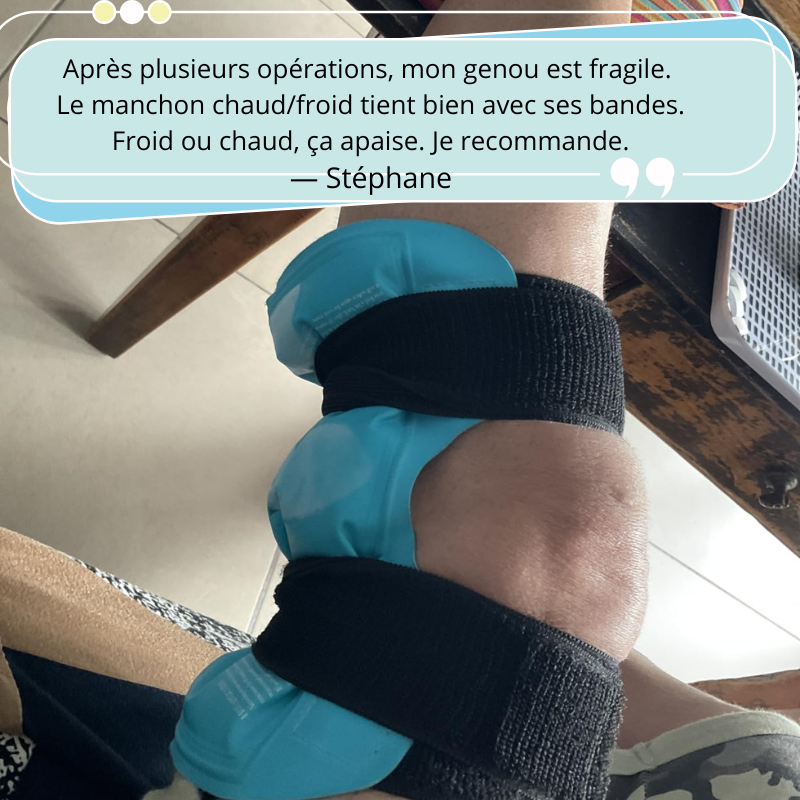 Chaud : Quand le genou est raide ou tendu. La chaleur détend et aide à bouger plus facilement. Chauffez le manchon (micro-ondes ou eau chaude selon la notice), vérifiez la température avec la main, puis appliquez 10–15 minutes. N’utilisez pas sur une peau irritée et espacez les séances.